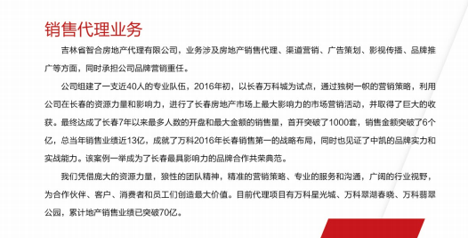 吉林省智合房地产代理有限公司、业务涉及房地产销售代理、集道营销、广告策划、影视传播、品牌推广等方面,同时承担公司品牌营销重任。